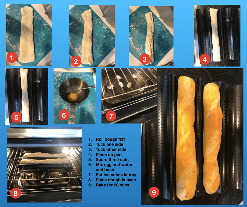 I mentioned I’ve done some research. It seems the trick to baguettes is in the baking. A few things are required. 1. A really hot oven. 470 F (240 C). A pan in the bottom to hold a few ice cubes that will generate some steam (more on this in a bit). And if you’re so inclined, a specialized backing rack. I am using a generic pan I picked up on Amazon for under $20. It is made of steel, coated with teflon and is perforated to provide the heat and steam to seep through.