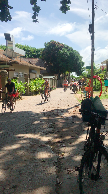 We are on bikes because the island, all of 5 kilometers wide and 7 km long, is so small and the weather is so reliably perfect, there is no better way to get around. A few internal-combustion-powered vehicles shuttle foods and wares, but that’s about it. You can walk, of course. You can even take an ox-pulled cart if you aren’t in a hurry (and why would you be?). But mostly all you see are bicycles.