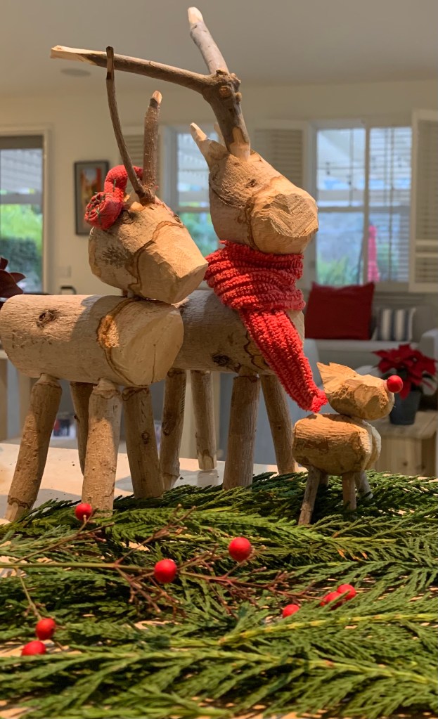 These little guys were hand-carved from branches our gardener cut down on our property. Instead of throwing them in the waste bin, we gave them a new life. The scarf and ear muffs were hand-sewn by Sherry from an old kitchen towel. Other than a little glue to hold the legs in, this project consists of 99% recycled material.