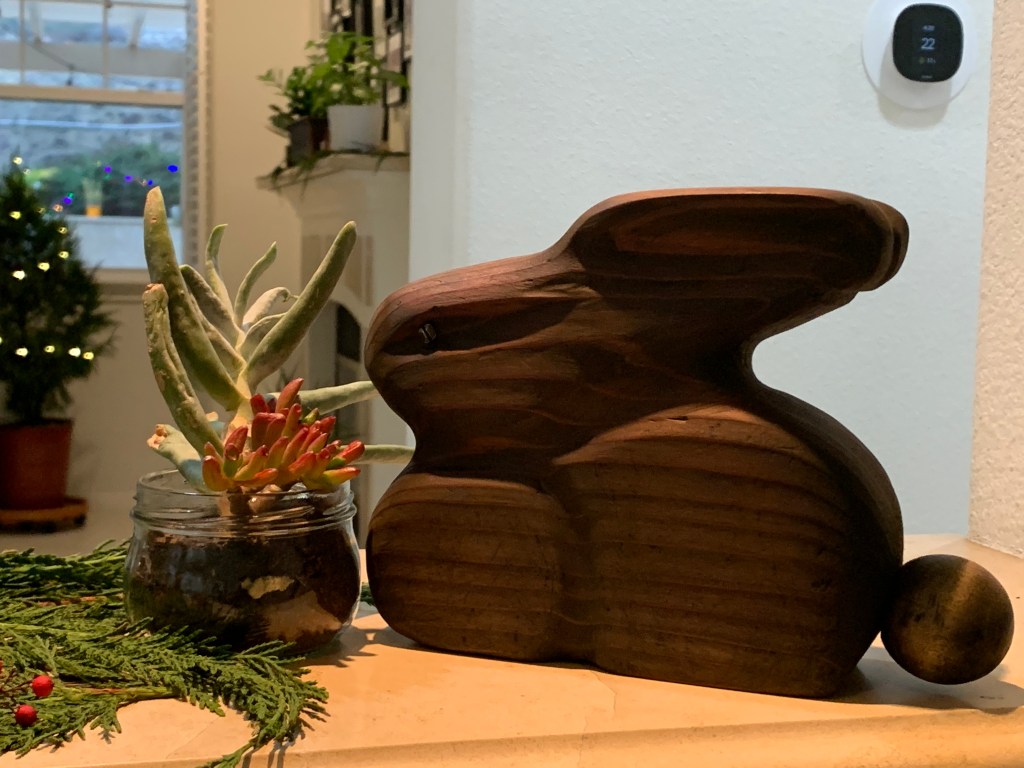 Sister Francine and her husband, Mike, created this beautiful little rabbit out of redwood. They aren’t sure of the genesis of the wood stock, but I’ll bet it was left over from a project, probably planters. It appears to be 2 inches thick. Our new friend is most appropriate for our little abode, since we live in an area known as Conejo Valley (conejo being Spanish for rabbit), and we have many such visitors in our back yard.