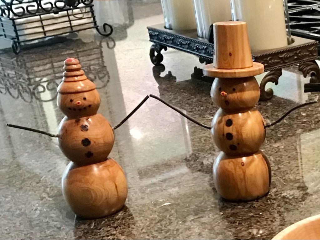 And one last pair of the snow people. Gene says he got the idea for these characters after joining a Facebook page for wood turners. The lady’s headgear was by accident, after the grain of the wood intended for the rim of the original hat split. Once again, this was a learning opportunity, and Gene made lemonade out of lemons. The end result is a lovely knit-cap effect.