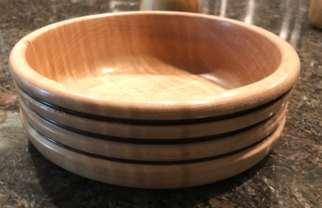 Here’s another bowl, made of maple. The blackened grooves are done with a wire that heats up as the wood is turning, creating the ebony effect.