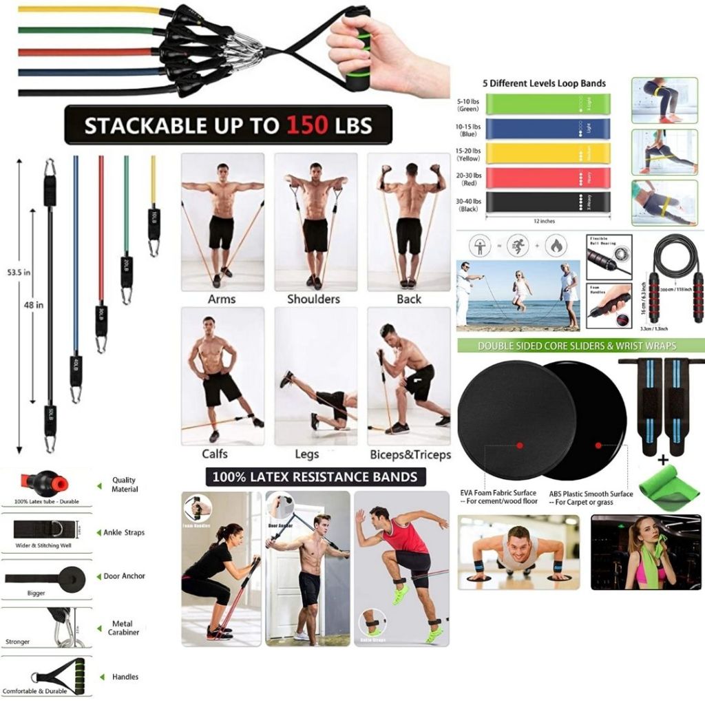 This set we got comes with stackable resistance bands up to 150 lbs, door anchor, ankle straps, handles, and many more accessories.