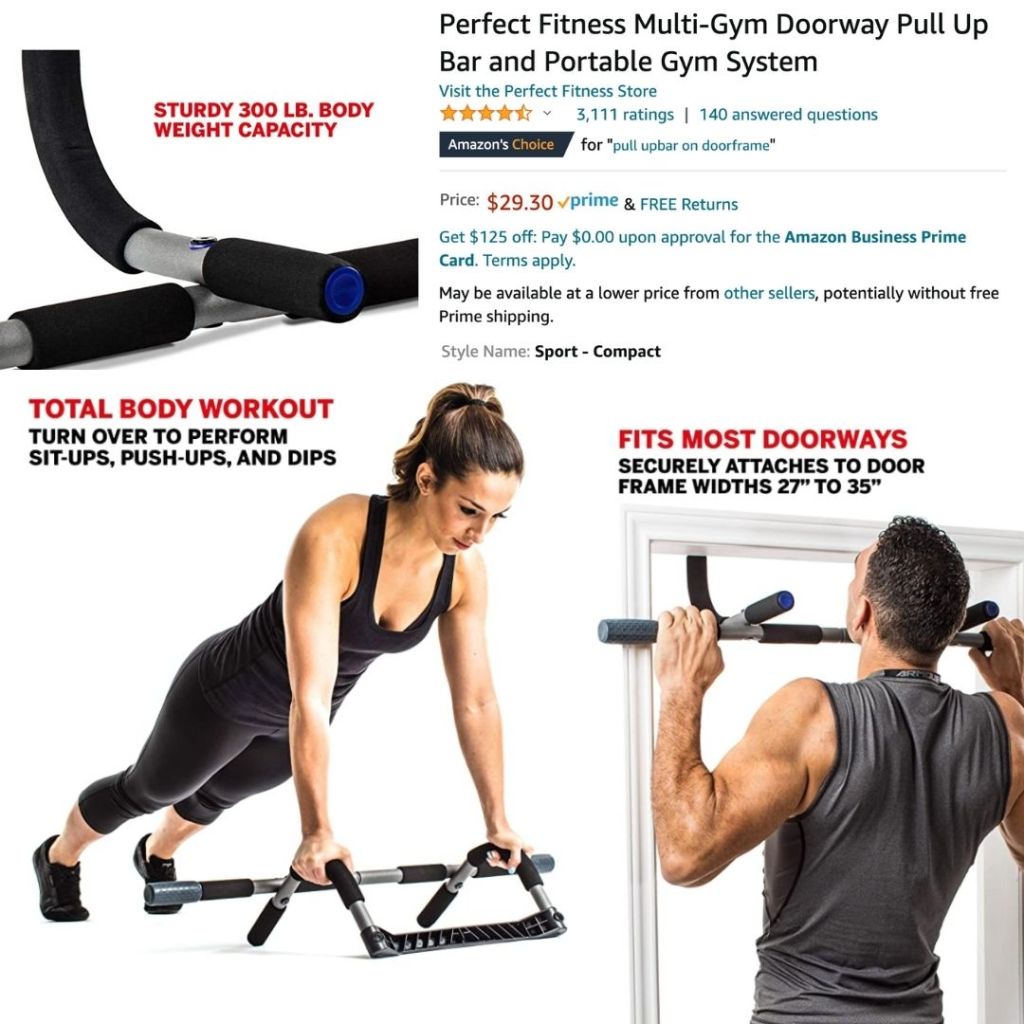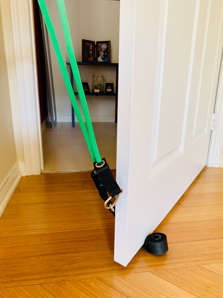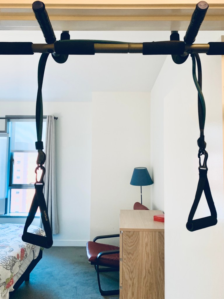 Our “gym space” consisted merely of a closet doorway. You can squeeze this in even the tightest New York apartment setting, and all for less than $100.