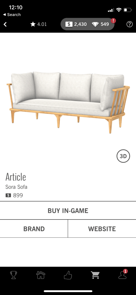 The game features 3D renditions of real furniture/decor items from real brands. Over time, I became quite familiar with each brand’s style and price range. I was shocked to find out that all of these brands are real! It made it more fun, even though I don’t think I could afford most of them. It’s nice to see how they look in different rooms, and be able to look at them from all angles in the 3D rendering.