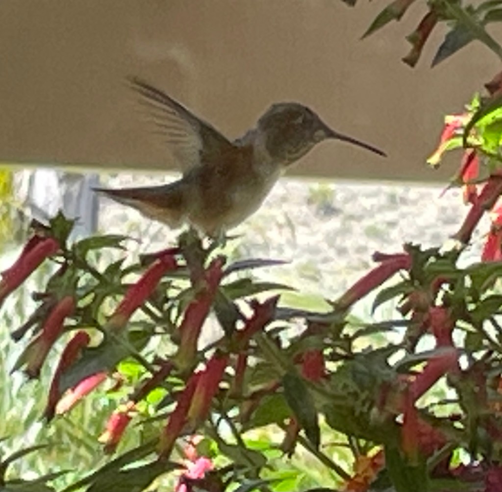 Now, apparently, they have called some relatives because yet another family is moving in, this time building a nest in a hanging plant in front of our kitchen window. We purchased this “cigar plant” because it attracts hummingbirds. But the finches feel right at home.