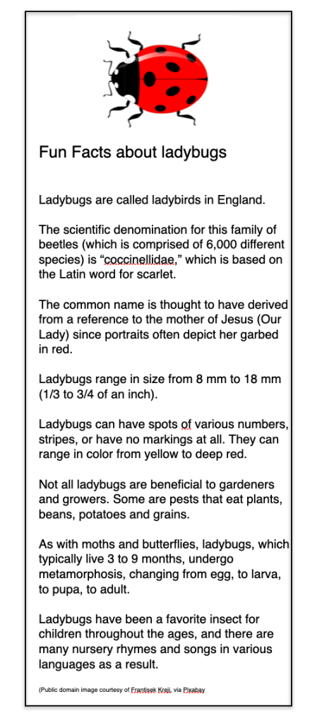 We shall leave the story about spiders for another day. But as for aphids, well they are the destroyer of many plants and Sherry loves her garden. And ladybugs, as any good gardener knows, eat aphids for a living. Sherry had already made up her mind to have Rhonda (if I may paraphrase the chorus of that Beach Boys song) help us get the aphids out of our life.